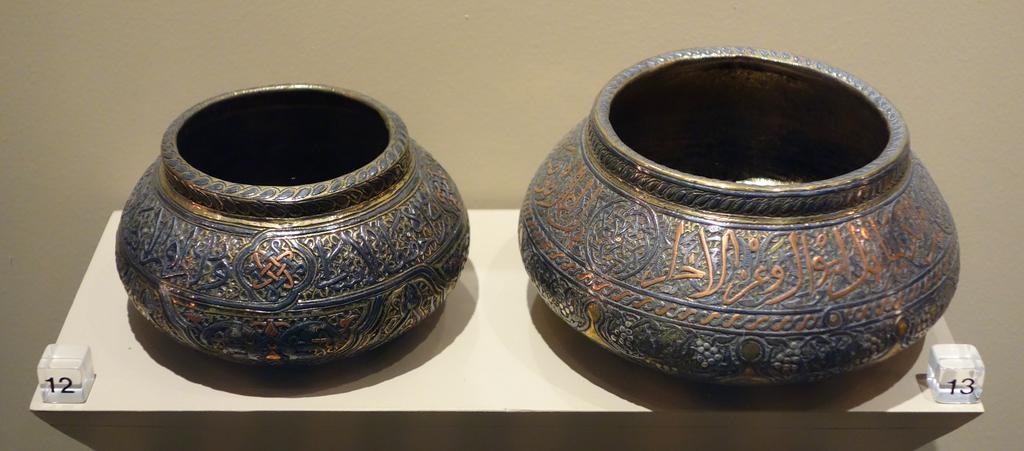 | Keywords: Bowls with bands of calligraphy and medallions, Egypt or Syria, 19th century AD, brass with copper and silver inlay - Huntington Museum of Art - DSC05057.JPG en Exhibit in the Huntington Museum of Art Huntington West Virginia USA Photography was permitted in the museum without restriction This artwork is in the public domain because the artist died more than 70 years ago 2013-05-16 14 02 57 own Daderot cc-zero Metalwork in the Huntington Museum of Art Uploaded with UploadWizard Mamluk metalwork |