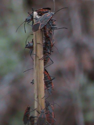 Keywords: Box elder bugs on deer grass.JPG en Swarm of box elder bugs Boisea trivittata sunning on Deer Grass in Chico California Mild winter has likely caused them to come out early Not to be confused with the Valley elderberry longhorn beetle or Melacoryphus lateralis which look similar own AerobicFox 2012-03-16 39 44 11 2 N 121 49 36 5 W Boisea trivittata Cc-zero sunning animals |
