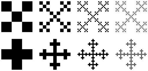 | Keywords: Box or Vicsek Fractal 4-iterations.svg Four iterations of a box fractal or Vicsek fractal derived by iteratively replacing a square with a saltire or cross of five smaller squares on a 3-by-3 subgrid Top Four iterations of the saltire form of the fractal Bottom Four iterations of the cross form of the fractal The second iteration is a form of the cross crosslet symbol of traditional heraldry Self-made graphic converted from the following vector PostScript source code <pre> 5 dup scale/sq 3 mul exch 3 mul exch moveto 3 0 rlineto 0 3 rlineto -3 0 rlineto closepath fill def/X 0 1 sq 1 1 sq 2 1 sq 1 0 sq 1 2 sq def/T 0 0 sq 1 1 sq 2 2 sq 0 2 sq 2 0 sq def/x 0 1 X1 1 1 X1 2 1 X1 1 0 X1 1 2 X1 def/t 0 0 T1 1 1 T1 2 2 T1 0 2 T1 2 0 T1 def/X1 9 mul exch 9 mul exch gsave translate X grestore def/T1 9 mul exch 9 mul exch gsave translate T grestore def/X2 27 mul exch 27 mul exch gsave translate x grestore def/T2 27 mul exch 27 mul exch gsave translate t grestore def/xx 0 1 X2 1 1 X2 2 1 X2 1 0 X2 1 2 X2 def/tt 0 0 T2 1 1 T2 2 2 T2 0 2 T2 2 0 T2 def/X3 81 mul exch 81 mul exch gsave translate xx grestore def/T3 81 mul exch 81 mul exch gsave translate tt grestore def/sqq /s exch def 1 7 8 setrgbcolor 0 0 moveto s 0 rlineto 0 s rlineto s neg 0 rlineto closepath fill 0 setgray def gsave 10 10 translate 27 dup scale 9 sqq X 0 11 translate 9 sqq T grestore gsave 307 10 translate 9 dup scale 27 sqq x 0 33 translate 27 sqq t grestore gsave 604 10 translate 3 dup scale 81 sqq xx 0 99 translate 81 sqq tt grestore gsave 901 10 translate 243 sqq 0 1 X3 1 1 X3 2 1 X3 1 0 X3 1 2 X3 0 297 translate 243 sqq 0 0 T3 1 1 T3 2 2 T3 0 2 T3 2 0 T3 grestore showpage EOF</pre> 2009 AnonMoos For the fifth iteration of the cross variant see File Box fractal svg center thumb 490px Box fractal svg Box fractals Images with PostScript source code Order 4 |