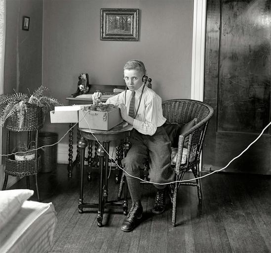 Keywords: boy device headphones black and white telegraph phone