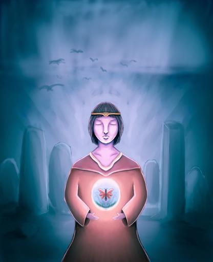 Keywords: boy man young kid magico wizard ruins brightness sphere fantasy magic witchcraft butterfly medieval digital art painting blue landscape moonlight