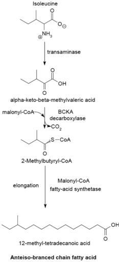 Keywords: Branched fatty acid synthesis-isoleucine.png en Synthesis of Branched chain fatty acids using isoleucine Own Bochyboch 2011-04-29 Cc-zero Check categories 2011 May 3 en wikipedia Fatty_acid_synthesis 1 Fatty acid synthesis