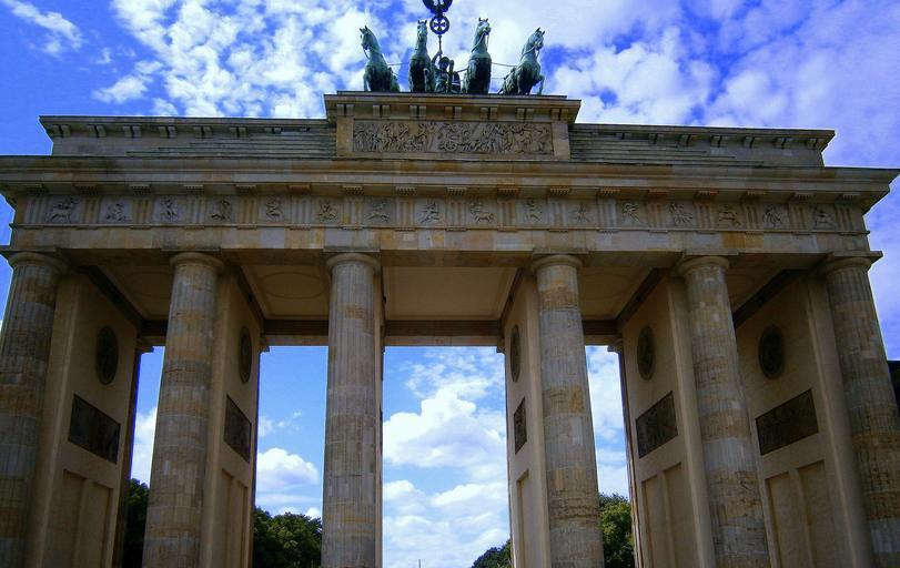 Keywords: brandenburg gate paris burst berlin landmark symbol history building architecture germany capital city imposing places of interest tourist attraction enormous sublime sky clouds blue cloud beautiful