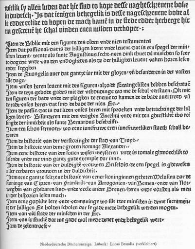 | Keywords: Brandis Book ad.JPG One page print by printer Lucas Brandis Lübeck listings his products c 1478; Source Ernst Voullieme Digitalisat http //www digitalis uni-koeln de/Voullieme/voullieme_index html PD-old Incunabula 1478 in Lübeck Lucas Brandis |