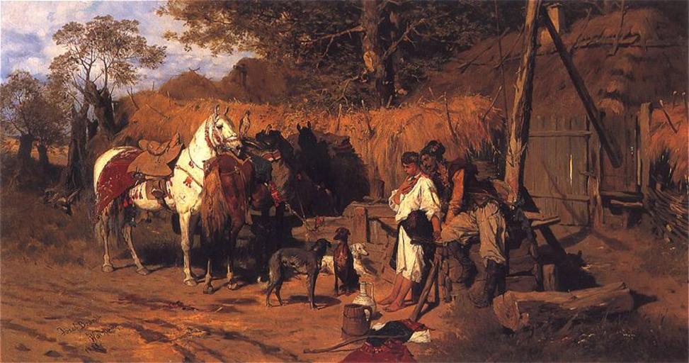 | Keywords: Brandt Kozak i dziewczyna.jpg  Artwork en Cossack and a girl at the well pl Kozak i dziewczyna przy studni oil canvas cm 51 99 Kielce Institution National Museum Kielce http //www pinakoteka zascianek pl/Brandt/Images/Kozak_i_dziewczyna jpg www pinakoteka zascianek pl 1875 Creator Józef Szermentowski PD-old-100 Other versions 19th-century genre paintings Józef Brandt Paintings in the National Museum in Kielce Zaporozhian Cossacks in art Szermentowski Józef Ukrainian Cossacks in art 19th-century paintings of horses Paintings of Cossacks |