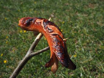 Keywords: bratwurst grill sausage red sausage grill sizzle fry heat eat meat barbecue grilling fire embers delicious