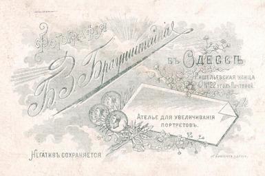| Keywords: Braunstein Odessa.jpg ru Паспа ту Фотог афия Б З Б аунштейна в Одессе Ришельевская ул 22 s 1900 - 1910s \ before 1917 Семейный а хив Г иго ия Ганзбу га Фишелес <gallery>File Nina Zähner jpg</gallery> PD-RusEmpire Uploaded with UploadWizard Photographers from Odessa Rishelievska Street |