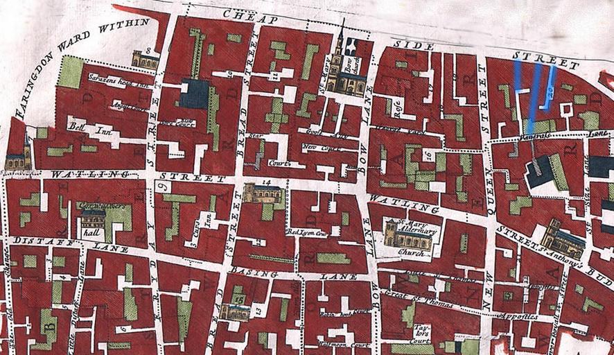 View Original:Bread_street_ward_and_Cordwainer_ward_1720_john_stow_with_streets_highlighted.jpg (1059x612)