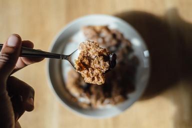 Keywords: breakfast cereals milk spoon meals eating utensils fingers hands person people bowls tables morning food breakfast table home flakes