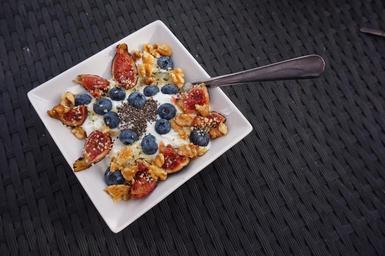 Keywords: breakfast muesli food cereals berries blueberries cornflakes spoon dishes morning eating milk fresh