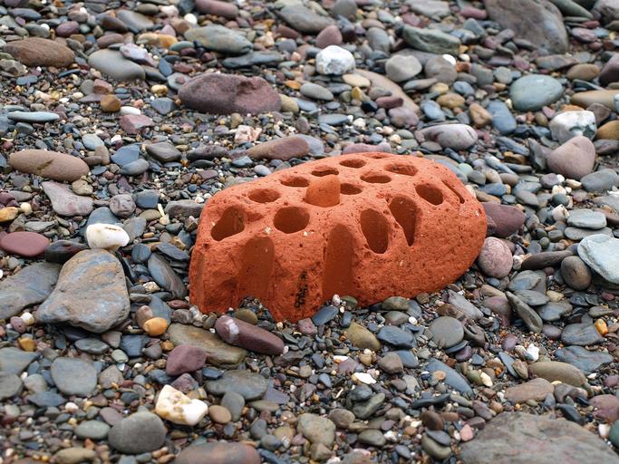 Keywords: brick stones unusual flushed sea coast beach pebble contrast out of place bizarre