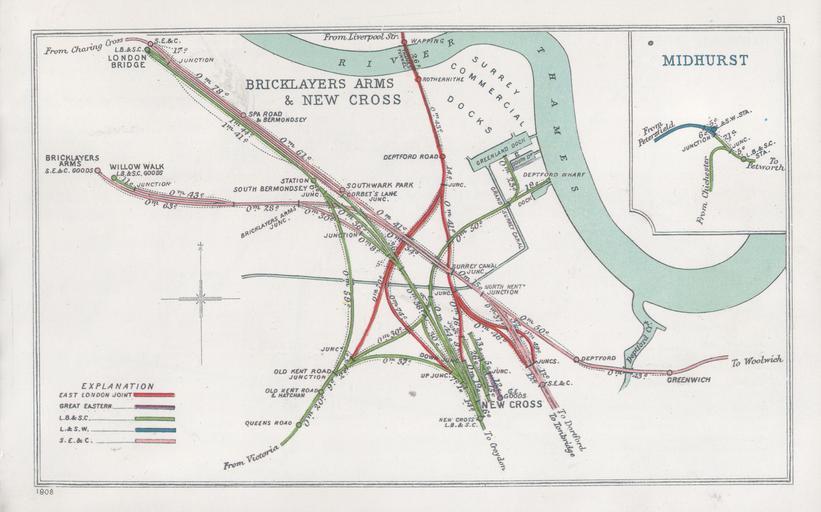 | Keywords: Bricklayers Arms & New Cross, Midhurst RJD 91.jpg Pre Grouping railway junction around Bricklayers Arms New Cross in S E London Also juctions at Midhurst West Sussex Railway Junction Diagram and 1908 1914 Railway Clearing House Author died more than 70 years ago - public domain PD-old Railways Junctions Diagram 1914 081-120 091 London RJD 1914 091 Kent RJD 1914 091 Middlesex RJD 1914 091 Surrey RJD 1914 091 Sussex RJD 1914 091 West Sussex RJD 1914 091 East London Railway RJD 091 London and South Western Railway RJD 091 London Brighton and South Coast Railway RJD 091 Great Eastern Railway RJD 091 South Eastern and Chatham Railway RJD 091 Deptford railway station New Cross railway station New Cross Gate railway station Rotherhithe station Surrey Quays railway station Wapping railway station Greenwich station London Bridge station Queens Road Peckham railway station South London Line Midhurst LBSCR railway station |