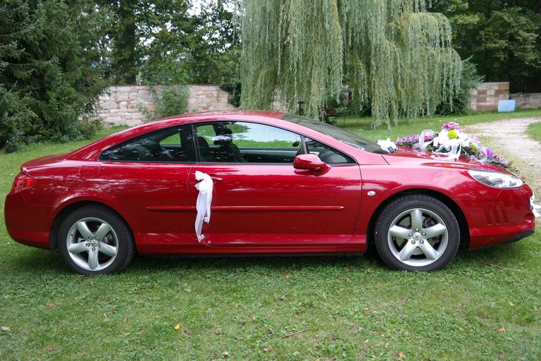 Keywords: bridal car wedding limousine spotlight flowers decoration auto red peugeot