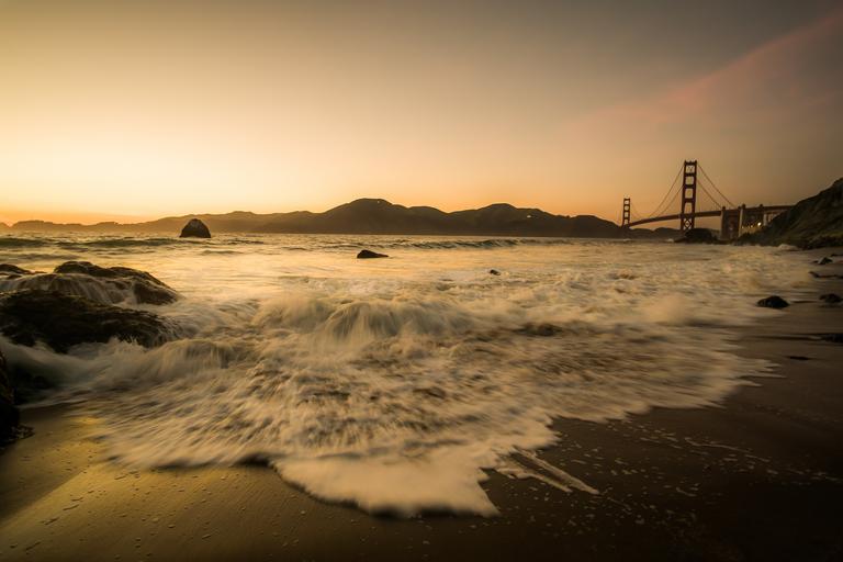 Keywords: bridge golden gate bridge sea ocean sunset beach last light