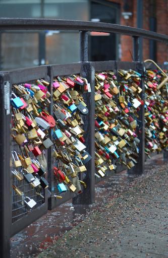 Keywords: bridge love lock padlock romantic romance symbol metal fence iron wet