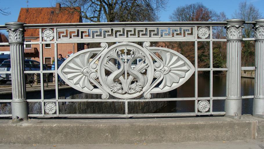 Keywords: Bridge Lüneburg 02.JPG Relief on Bridge own own photograph 06 03 2011 own own photograph Railing details of Ilmenaubrücke Altenbrückertorstraße Lüneburg Symbols from Lüneburg Wrought iron in Lower Saxony