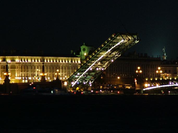 | Keywords: Bridge Neva Petersburg.jpg  Trinity Bridge over Neva is being lifted Saint Petersburg Russia Разведённый Т оицкий мост над  евой Санкт-Пете бу г Россия Own 2006-07-12 Horvat PD Trinity Bridge Saint Petersburg at night July 2006 in Saint Petersburg |