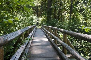 Keywords: bridge pathway planked wooden logs forest walkway landscape outdoors park nature trees scenic shadows