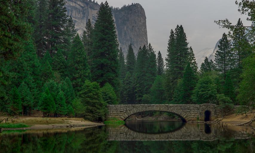 Keywords: bridge water reflection river pond lake calm glassy smooth crossing nature landscape trees forest arch way path structure