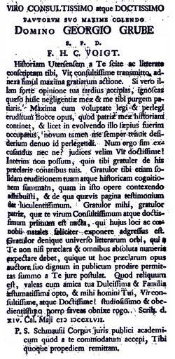 Keywords: Brief von Friedrich Heinrich Voigt an Jürgen (Georg) Grube (Lateinisch).jpg de Brief von Friedrich Heinrich Voigt an Jürgen Georg Grube auf Lateinisch nochmals nachbearbeitet à bersetzung Seinen hochkundigen und hochgelehrten den meistzuverehrenden seiner Gönner Herrn Georg Grube grüßt herzlich F H C Voigt Die von dir hochgelehrter Mann kundig und gebildet geschriebene Geschichte Uetersens übersende ich dir zugleich verbunden mit bestem Dank Wenn du sie aber vielleicht später als gedacht erhältst mögest du mir bitte meine Nachlässigkeit verzeihen und mich mich rechtfertigen lassen Mit größter Lust habe ich dieses gebildete Werk das die Geschichte meiner Heimat enthält wieder und wieder gelesen und mag ich auch schon ziemlich häufig damit beschäftigt gewesen sein es aufzuschlagen so hielt mich doch immer wieder das Verlangen fest es von neuem durchzulesen Sollte mir denn zu verzeihen sein oder nicht Das möchte ich dich hochgelehrter Mann bitten zu beurteilen Einstweilen muss ich dir einfach zu deinem glänzenden Unterfangen gratulieren Ich gratuliere dir auch zu deiner soliden Bildung und deiner überaus großen Geschichtskenntnis die du bei der Erstellung dieses Werks eingesetzt hast und von der jede Seite tüchtigstes Zeugnis ablegt Ich gratuliere mir und ich gratuliere der Heimat die dich hochgelehrten und hochgebildeten Mann als ersten bekommen hat der es angegangen ist die Geburt dieses Ortes und Klosters erfolgreich darzustellen Ich gratuliere schließlich der ganzen akademischen Welt die von dir nur Hervorragendes und in jeder Hinsicht Vollständiges erwarten darf und mit vollstem Recht von dir fordert dieses hervorragende und seines Autors würdige Werk veröffentlichen zu lassen Was nun bleibt ich wünsche dir mit deiner ganz reizenden Freundin und deiner höchst geschätzten Familie alles Gute und bitte dich hochkundiger und hochgelehrter Mann mir der ich dir ganz zugetan und gehorsam bin inständig mir weiterhin gewogen zu bleiben P S Das Schmaussche Corpus iuris publici academicum das ich von dir leihweise erhalten habe will ich dir ebenfalls bald zurückschicken de eigene reproduktion das Original mehr als 100 Jahre alt en own reproduktion original is more than 100 years old Fotografie aus dem Buch Vermischte historisch-politische Nachrichten in Briefen von einigen merkwürdigen Gegenden der Herzogthümer Schleßwig und Hollstein ihrer natürlichen Geschichte und andern seltenen Alterthümern 1762 Johann Friedrich Camerer 1720-1792 Friedrich Heinrich Voigt 1725-1795 1747-04-17 50px PD-old-100 Historical Deeds of the Monastery Uetersen 1747 documents Deeds Documents of Uetersen 1747 texts