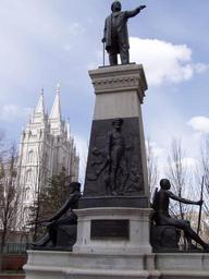 Keywords: Brigham Young Monument.jpg Brigham Young Monument or Pioneer Monument a bronzed historical monument located on the north sidewalk of the intersection at Main and South Temple Streets of Salt Lake City Utah It was originally erected in the center of the intersection of Main and South Temple streets in 1897 where it stood until 1993 when it was moved a few yards north to its present location near the Joseph Smith Memorial Building Artist Cyrus Edwin Dallin <br>Photo Dundak Artwork 1897<br>Photo 13 49 15 March 2005 Artist Cyrus Edwin Dallin November 22 1861 “ November 14 1944 <br>Photo Dundak Statue PD-old-auto-1923 1944 Photo GFDL Cc-by-sa-3 0-migrated Brigham Young Monument Salt Lake Temple Taken with Olympus C-720UZ |