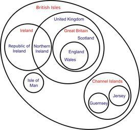 Keywords: British Isles Venn Diagram-en.svg A scalable vector version of the British Isles Venn Diagram from Wikipedia http //en wikipedia org/wiki/Image British_Isles_Venn_Diagram png This version unlike the PNG version on Wikipedia features some small changes and improvements including referring to the Republic of Ireland as such instead of just Ireland Additionally the Ireland as in the island text is now in the middle It might not look that great but it's the best way to illustrate it Red text refers to geographical areas blue text refers to political entities To keep in tradition with the PNG image this image will additionally be released into the public domain Original version of the SVG by Messedrocker 2006-07-26 own assumed ScislaC Other Versions in Polish Subdivisions of the United Kingdom Euler diagrams Membership diagrams |