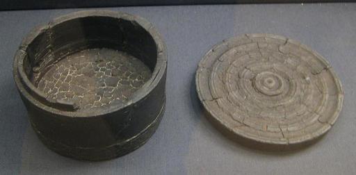 Keywords: British Museum Thetford Hoard shale pot.jpg en Shale pot from the Thetford Hoard own BabelStone 2010-08-21 Details Turned circular shale box with a raised lid-seating from the Thetford Hoard Height 53 mm box <br/>Height 14 mm lid <br/>Diameter 100 mm box <br/>Diameter 105 mm lid G49/dc23 cc-zero Thetford Hoard Pot lids |