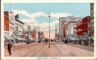 | Keywords: vcu libraries vculibraries vcu digital collections vcudigitalcollections outdoor photo border road drawing Description: Broad Street is true to its name, being nearly twice as wide as any other street in Richmond. It extends in a straight line the full length of the City, and is equally broad at all points. At night it is brilliantly illuminated, and its 'Great White Way,' lined with handsome stores and shops, with their attractive displays, presents a scene of alluring beauty, and makes it a favorite promenade. This view (looking East from 6th street) shows a portion of the busy shopping and hotel district, on the right, and the famous 'movie' district, on the left. Manufacturer: Southern Bargain House, Richmond, Va. Date Postmarked: Not postmarked. Rights: This item is in the public domain. Acknowledgement of the Virginia Commonwealth University Libraries as a source is requested. Reference URL: dig.library.vcu.edu/u?/postcard,360 Collection: Rarely Seen Richmond: Early twentieth century Richmond as seen through vintage postcards Description: Broad Street is true to its name, being nearly twice as wide as any other street in Richmond. It extends in a straight line the full length of the City, and is equally broad at all points. At night it is brilliantly illuminated, and its 'Great White Way,' lined with handsome stores and shops, with their attractive displays, presents a scene of alluring beauty, and makes it a favorite promenade. This view (looking East from 6th street) shows a portion of the busy shopping and hotel district, on the right, and the famous 'movie' district, on the left. Manufacturer: Southern Bargain House, Richmond, Va. Date Postmarked: Not postmarked. Rights: This item is in the public domain. Acknowledgement of the Virginia Commonwealth University Libraries as a source is requested. Reference URL: dig.library.vcu.edu/u?/postcard,360 Collection: Rarely Seen Richmond: Early twentieth century Richmond as seen through vintage postcards |