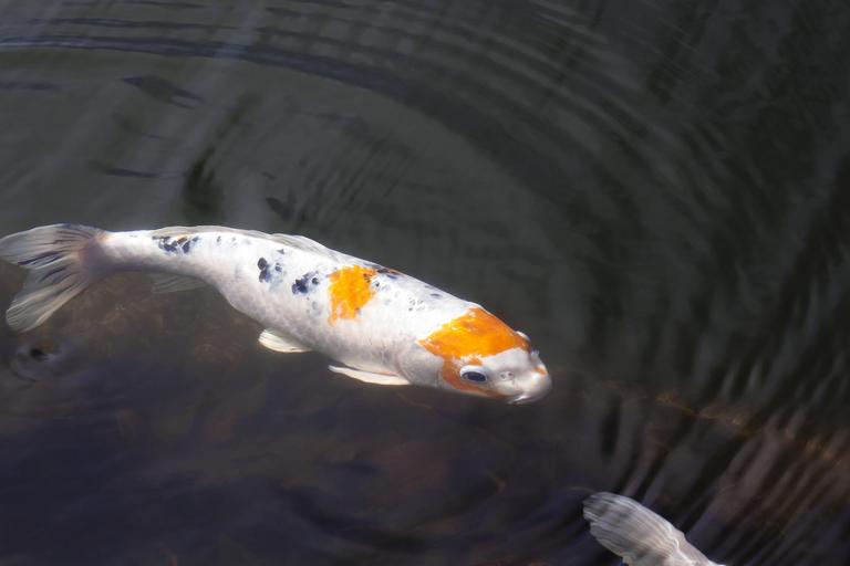 Keywords: brocade carp koi carp fish swim pond water white black yellow orange cultivar japan japanese china wealth luck mirroring water surface