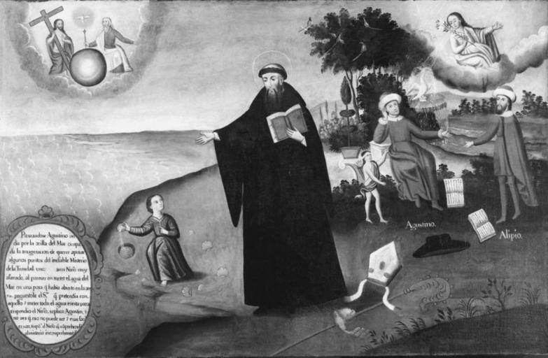 Keywords: Brooklyn Museum - The Legend of San Augustine - Pedro Nolasco y Lara - overall.jpg Peru The Legend of San Augustine century 18 oil canvas cm 166 4 111 1 Museum Brooklyn Museum Museum Expedition 1941 Frank L Babbott Fund Paseandose Agustino un/ dia por la orilla del Mar ocupa-/ da la imaginacion de querer apunar/ algunos puntos del inefable Misterio / de la Trinidad enc aun Niño muy / afanado al parecer en meter el agua del/ Mar en una posa q habia abierto en la are/na preguntole el Sto q pretendía con/ aquello meter toda el agua enesta poza/ respondio el Niño replico Agustín ¿ / no ves q eso no puede ser mas facil/ es esto Icspôº el Nino q comprehende/ el misterio incomprehensible bottom left es Agustino right Alipio right http //www brooklynmuseum org/opencollection/objects/680/The_Legend_of_San_Augustine Online Collection of Brooklyn Museum; Photo Brooklyn Museum 41 1275 192_bw jpg 41 1275 192 Brooklyn_Museum-no_known_restrictions PD-Art Art of Peru Paintings of Augustinus Christian paintings in the Brooklyn Museum Oil paintings of men Black and white reproductions of paintings in color Pedro Nolasco y Lara ImageNote 1 5 298 135 199 768 502 2 Paseandose Agustino un/ dia por la orilla del Mar ocupa-/ da la imaginacion de querer apunar/ algunos puntos del inefable Misterio / de la Trinidad enc aun Niño muy / afanado al parecer en meter el agua del/ Mar en una posa q habia abierto en la are/na preguntole el Sto q pretendía con/ aquello meter toda el agua enesta poza/ respondio el Niño replico Agustín ¿ / no ves q eso no puede ser mas facil/ es esto Icspôº el Nino q comprehende/ el misterio incomprehensible ImageNoteEnd 1