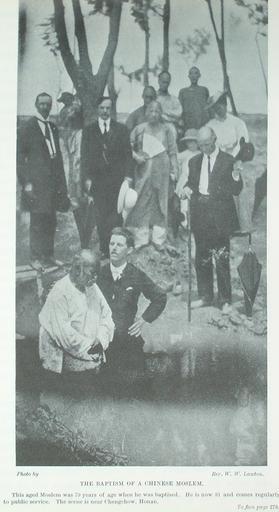 Keywords: Broomhall-The-baptism-of-a-Chinese-Moslem.png en Baptism of a Chinese Moslem a Hui person by Christian missionaries near Zhengzhou Henan no later than 1908 A caption in a book published in 1910 refers to the event as taking place at least 2 years ago The original caption Photo by Rev W W Lawton THE BAPTISM OF A CHINESE MOSLEM This aged Moslem was 79 years of age when he was baptized He is now 81 and comes regularly to public service The scene is near Chengchow Honan ru К ещение 79-летнего китайского дунганина х истианскими миссионе ами близ г Чжэнчжоу п ов Хэнань е позднее 1908 г Photo published in 1910 in the book by Marshall Broomhall Islam in China a neglected problem Ph Photo by Rev W W Lawton as per the caption Photo taken no earlier than 1908; published in 1910 and possibly in earlier books as well PD-old Baptism of people Missionaries Hui people Christianity in China Historical images of Henan