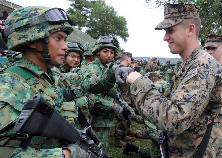 Keywords: Brunei and US forces in CARAT 2011.jpg en U S Marine Corps Lance Cpl Richard Hooper right assigned to Fleet Antiterrorism Security Team Pacific says goodbye to a Bruneian land forces soldier following military operations on urban terrain training in support of Cooperation Afloat Readiness and Training CARAT Brunei 2011 in Seria Brunei Oct 6 2011 CARAT is a series of bilateral exercises held annually in Southeast Asia to strengthen relationships and to enhance force readiness 2011-10-06 11 23 47 http //www defenseimagery mil/imagery html a search s brunei 20military chk 6cfe0 n 90 guid ef74cd5757aa55c15c943fb1fc4c06289250a168 Mass Communication Specialist 2nd Class Jessica United States Navy PD-USGov-Military-Navy Uploaded with UploadWizard Army of Brunei Cooperation Afloat Readiness and Training 2011 Military camouflage clothing Males with M16 rifle |