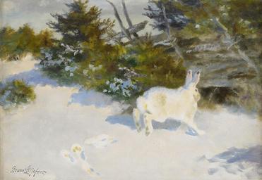 Keywords: Bruno Liljefors - Hare in winter landscape.jpg Artwork en Hare in winter landscape sv Hare i vinterlandskap creator Bruno Liljefors Oil canvas cm 35 5 50 5 http //auktionsverket se/auction/fine-arts/2010-12-08/2634-bruno-liljefors-1860-1939-hare-i-vinterlandskap-si/ Stockholms Auktionsverk PD-old-auto 1939 Paintings by Bruno Liljefors with hares Winter landscape paintings Landscape paintings of Sweden |