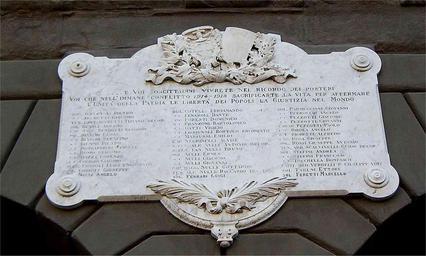 Keywords: BS-Iseo-005-caduti-prima-guerra-mondiale.jpg it Iseo BS - lapide commemorativa dei caduti di Iseo nella guerra del 1914-1918 apposta sulla facciata del Municipio la lapide recita ¦E VOI CONCITTADINI VIVRETE NEL RICORDO DEI POSTERI <br> VOI CHE NELL ™IMMANE CONFLITTO 1914 “ 1918 SACRIFICASTE LA VITA PER AFFERMARE <br> L ™UNITA ™ DELLA PATRIA LE LIBERTA ™ DEI POPOLI LA GIUSTIZIA NEL MONDO Segue l ™elenco su tre colonne dei 47 Caduti 1a colonna a sinistra 15 nominativi Sol ALBERTONI PIETRO Sol ARCHETTI GIACOMO Ten Fant ARCHETTI TIZIANO Decor Sol BENALI ABRAMO Cap Magg BENDOTTI GIACOMO Sol BIANCHI LEONE Sol BIANCHI SERAFINO Sol BIEMMI PIETRO Sol BOMBARDIERI SAMUELE Sol BUSTO GIACOMO Sol BUIZZA LORENZO Sol COLOMBO GIACOMO Serg CONSOLI LUIGI Encomiato Sol CONSOLI GIUSEPPE Sol NULLI ANGELO 2a colonna al centro 16 nominativi Sol COTELLI FERDINANDO Sol FENAROLI DANTE Sol FORESTI DOMENICO Sol FRANZONI BARTOLOMEO Sol GATTI VIRGILIO Sol LISSIGNOLI BORTOLO Encomiato Sol MASSUSSI EMILIO Cap NEGRINELLI ALVISE S Ten Alp NULLI ANTONIO Decorato S Ten Fan NULLI BRUNO Sol NULLI ERMES Sol NULLI GIACOMO Sol NULLI GIOVANNI Cap Magg NULLI GOTTARDO Ten Alp NULLI RICCARDO Dec Val Sol FERRARI LUIGI 3a colonna a destra 16 nominativi Sol PARMEGGIANI GIOVANNI Sol PEDROCCHI ANGELO Sol PEZZOTTI GIACOMO Sol PEZZOTTI GIOVANNI Carab PEZZOTTI PAOLO Cap RIBOLA ANGELO Sol RIGHETTI AFREDO Cap ROSA GIUSEPPE Sol ROSSI GIUSEPPE ANTONIO Ten Ard SCALVINELLI GUIDO Decor Sol STEFINI ANDREA Sol STEFINI FRANCESCO Sol TOCCHELLA DOMENICO Capit Med VERDELLI P GIUSEPPE Vol Sol TABENI ETTORE Sol FERETTI MARCELLO own Albertomos 2009 nessuna ImageNote 1 281 330 1232 97 1729 1039 2 <center> ¦E VOI CONCITTADINI VIVRETE NEL RICORDO DEI POSTERI <br> VOI CHE NELL ™IMMANE CONFLITTO 1914 “ 1918 SACRIFICASTE LA VITA PER AFFERMARE <br> L ™UNITA ™ DELLA PATRIA LE LIBERTA ™ DEI POPOLI LA GIUSTIZIA NEL MONDO </center> ImageNoteEnd 1 ImageNote 2 279 441 393 296 1729 1039 2 Sol ALBERTONI PIETRO Sol ARCHETTI GIACOMO Ten Fant ARCHETTI TIZIANO Decor Sol BENALI ABRAMO Cap Magg BENDOTTI GIACOMO Sol BIANCHI LEONE Sol BIANCHI SERAFINO Sol BIEMMI PIETRO Sol BOMBARDIERI SAMUELE Sol BUSTO GIACOMO Sol BUIZZA LORENZO Sol COLOMBO GIACOMO Serg CONSOLI LUIGI Encomiato Sol CONSOLI GIUSEPPE Sol NULLI ANGELO ImageNoteEnd 2 ImageNote 3 692 438 415 292 1729 1039 2 Sol COTELLI FERDINANDO Sol FENAROLI DANTE Sol FORESTI DOMENICO Sol FRANZONI BARTOLOMEO Sol GATTI VIRGILIO Sol LISSIGNOLI BORTOLO Encomiato Sol MASSUSSI EMILIO Cap NEGRINELLI ALVISE S Ten Alp NULLI ANTONIO Decorato S Ten Fan NULLI BRUNO Sol NULLI ERMES Sol NULLI GIACOMO Sol NULLI GIOVANNI Cap Magg NULLI GOTTARDO Ten Alp NULLI RICCARDO Dec Val Sol FERRARI LUIGI ImageNoteEnd 3 ImageNote 4 1115 436 432 285 1729 1039 2 Sol PARMEGGIANI GIOVANNI Sol PEDROCCHI ANGELO Sol PEZZOTTI GIACOMO Sol PEZZOTTI GIOVANNI Carab PEZZOTTI PAOLO Cap RIBOLA ANGELO Sol RIGHETTI AFREDO Cap ROSA GIUSEPPE Sol ROSSI GIUSEPPE ANTONIO Ten Ard SCALVINELLI GUIDO Decor Sol STEFINI ANDREA Sol STEFINI FRANCESCO Sol TOCCHELLA DOMENICO Capit Med VERDELLI P GIUSEPPE Vol Sol TABENI ETTORE Sol FERETTI MARCELLO ImageNoteEnd 4 Plaques in Iseo World War I memorials in Italy Plaques referencing 1914 Plaques referencing 1918 War memorials in the province of Brescia Iseo |