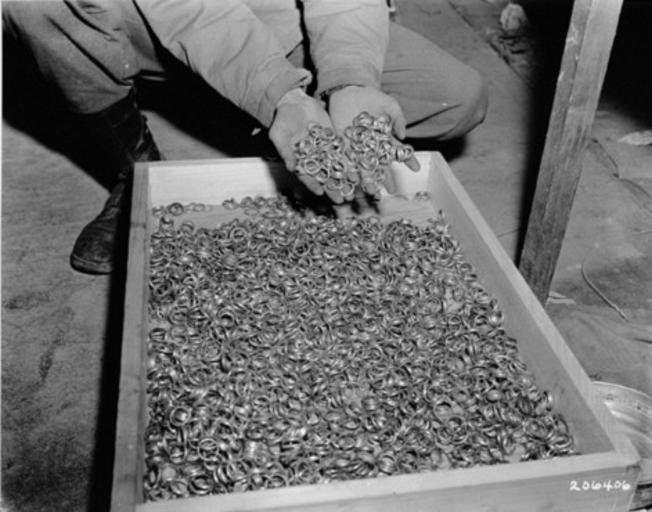| Keywords: Buchenwald Property 80623.jpg A soldier dips his hands into a crate full of rings confiscated from prisoners in Buchenwald and found by American troops in a cave adjoining the concentration camp Original caption reads These are a few of the thousands of wedding rings the Germans removed from their victims in order to salvage the gold U S First Army troops found these rings with watches precious stones eyeglasses and gold teeth fillings in a cave adjoining the Buchenwald concentration camp near Weimar Germany 5/5/45 Buchenwald Thuringia Germany May 5 1945 http //www ushmm org/ United States Holocaust Memorial Museum courtesy of National Archives and Records Administration College Park PD-USGov Clothing and possessions of Holocaust victims Images from the United States Holocaust Memorial Museum |