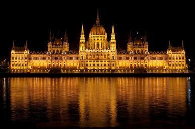Keywords: budapest hungary parliament building palace architecture river lake water reflections spires night evening sky shoreline lights lighting beautiful outside hungarian parliament golden national assembly national assembly of hungary legislative building landmark popular tourist destination destination lajos kossuth square danube large