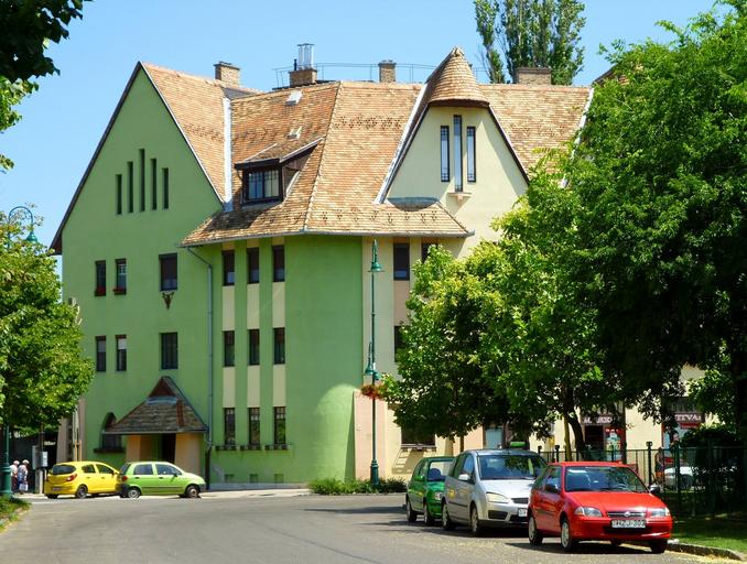 Keywords: budapest hungary wekerle battery dwelling house art nouveau facade green white car blue sky