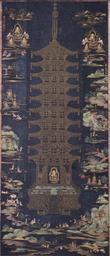 | Keywords: Buddhist Paradise with Golden Pagoda.jpg  A picture of Buddhist Paradise with Golden Pagoda 紺紙著色金光明  王経金字 塔曼荼羅図 konshichakushoku konkōmyō saishō ōkyō kinji hōtō mandarazu one of ten hanging hanging scrolls mandalas 139 7 cm x 54 8 cm Gold paint on indigo blue paper Located at Chūson-ji Hiraizumi Iwate Japan http //blogs yahoo co jp/tigerwoodsjp/62008616 html author Heian period before 1185 PD-old-100 Chusonji Mandalas of Japan Paintings of the Heian period National Treasures of Japan paintings Konkōmyō Saishōō-kyō |
