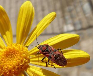 Keywords: bug insect red libar daisy yellow flower