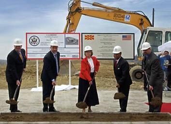 | Keywords: Build new embassy in Skopje.jpg  From left Richard Graves of KBR Services Macedonian President Branko Crvenkovski U S Ambassador to Macedonia Gillian Milovanovic Overseas Buildings Opera-tions Director Charles Williams and OBO Project Director Stephen Ziegenfuss pose during a ground breaking ceremony for the new U S Embassy compound in Macedonia ™s capital Skopje March 2006 http //www state gov/cms_images/fy2006par_ps_sg12_7a jpg 2006-03 US Government PD-USGov International relations of the Republic of Macedonia Ground-breaking ceremonies Gillian A Milovanovic Branko Crvenkovski Five people People with hard hats |