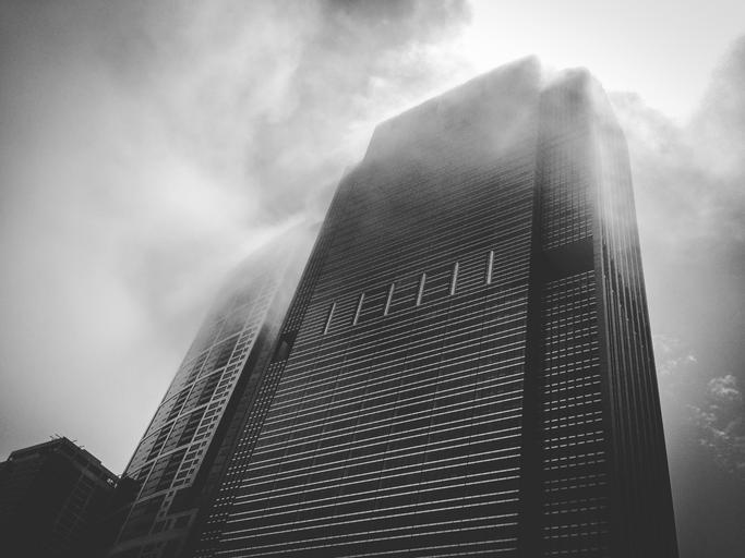 Keywords: building architecture modern contemporary skyscraper high tall tower facade uo construction design structure urban city exterior shape black and white clouds mist fog