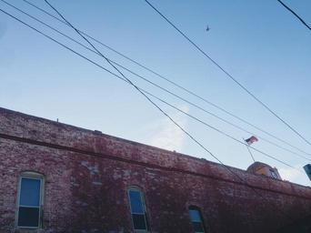 Keywords: building bricks wall american flag usa power lines architecture