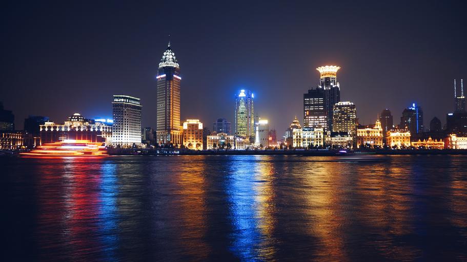 Keywords: buildings skyline architecture towers high rises night dark city water reflection lights urban