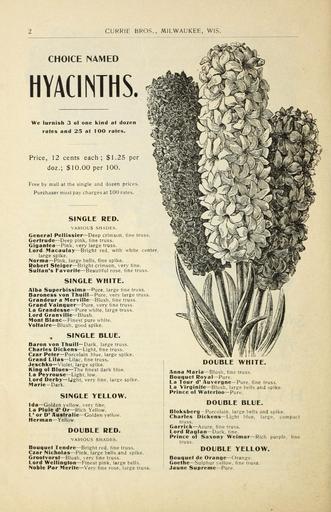 | Keywords: Bulbs and plants (16386614981).jpg CURRIE BROS MILWAUKEE WIS <br> CHOICE NAMED <br> HYACINTHS <br> We furnish 3 of one kind at dozen <br> rates and 25 at 100 rates <br> Price 12 cents each; 1 25 per <br> doz ; 10 00 per 100 <br> Free by mail at the single and dozen prices <br> Purchaser must pay charges at 100 rates <br> SINGLE RED <br> VARIOUS SHADES <br> General Pellissier Deep crimson fine truss <br> Gertrude Deep pink tine truss <br> Gigantea Pink very large truss <br> Lord Macaulay Bright red with white center <br> large spike <br> Norma Pink large bells fine spike <br> Robert Steiger Bright crimson very fine <br> Sultan's Favorite Beautiful rose fine truss <br> SINGLE WHITE <br> Alba Superbissima Pure large fine truss <br> Baroness von Thuill Pure very large truss <br> Grandeur a Merville Blush fine truss <br> Grand Vainquer Pure very fine truss <br> La Grandesse Pure white large truss <br> Lord Granville Blush <br> Mont Blanc Finest pure white <br> Voltaire Blush good spike <br> SINGLE BLUE <br> Baron von Thuill Dark large truss <br> Charles Dickens Light fine truss <br> Czar Peter Porcelain blue large spike <br> Grand Lilas Lilac fine truss <br> Jeschko Violet large spike <br> King of Blues The finest dark blue <br> La Peyrouse Light low <br> Lord Derby Ught very fine large spike <br> Marie Dark <br> SINGLE YELLOW <br> Ida Golden yellow very fine <br> La Pluie d' Or Rich Yellow <br> L' or D Australie Golden yellow <br> Merman Yellow <br> DOUBLE RED <br> VARIOUS SHADES <br> Bouquet Tendre Bright red fine truss <br> Czar Nicholas Pink large bells and spike <br> Grootvorst Blush very fine truss <br> Lord Wellington Finest pink large bells <br> Noble Par Merite Very fine rose large truss <br> DOUBLE WHITE <br> Anna Maria Blush fine truss <br> Bouquet Royal Pure <br> La Tour d' Auvergne Pure fine truss <br> La Virginite Blush large bells and spike <br> Prince of Waterloo Pure <br> DOUBLE BLUE <br> Bloksberg Porcelain large bells and spike <br> Charles Dickens Light blue large compact <br> truss <br> Garrick Azure fine truss <br> Lord Raglan Dark tine <br> Prince of Saxony Weimar Rich purple tine <br> truss <br> DOUBLE YELLOW <br> Bouquet de Orange Orange <br> Goethe Sulphur yellow tine truss <br> Jaune Supreme Pure 42214132 133055 65937 Page 2 Text http //www biodiversitylibrary org/page/42214132 1908 10 5962/bhl title 65937 Currie Brothers Company ; Henry G Gilbert Nursery and Seed Trade Catalog Collection NameFound Gigantea NameConfirmed Gigantea EOLID 91906 NameBankID 4549793 NameFound Lilac NameConfirmed Lilac P Miller 1754 NameFound Superbissima Biodiversity Heritage Library Currie Bros Co Bulbs and plants autumn 1901 Garden Stories Bulbs Plants Catalogs Flowers Nurseries Horticulture Plants Ornamental Seeds U S Department of Agriculture National Agricultural Library bhl page 42214132 dc identifier http //biodiversitylibrary org/page/42214132 bhlGardenStories BHLinbloom bulbs plants nurseries horticulture plants ornamental u s department of agriculture national agricultural library bhlgardenstories bhlinbloom Information field Flickr posted date ISOdate 2015-01-28 Check categories 2015 August 24 CC-BY-2 0 BioDivLibrary https //flickr com/photos/61021753 N02/16386614981 2015-08-24 07 55 46 cc-by-2 0 PD-old-70-1923 Currie Bros catalogs Photos uploaded from Flickr by FĂŚ using a script |