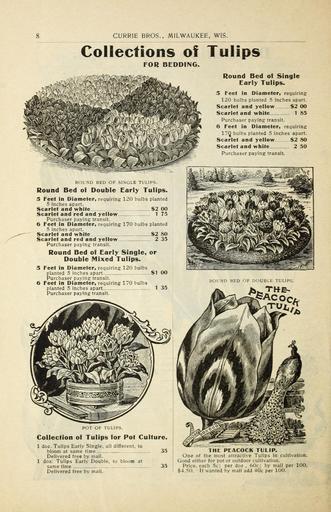 Keywords: Bulbs and plants (16386626041).jpg CURRIE BROS MILWAUKEE WIS <br> Collections of Tulips <br> FOR BEDDING <br> U <br> mmm <br> Round Bed of Single <br> Early Tulips <br> 5 Feet in Diameter requiring <br> 120 bulbs planted 5 inches apart <br> Scarlet and yellow 2 00 <br> Scarlet and white 1 85 <br> Purchaser paying transit <br> 6 Feet in Diameter requiring <br> 170 bulbs planted 5 inches apart <br> Scarlet and yellow 2 80 <br> Scarlet and white 2 50 <br> Purchaser paying transit <br> ROUND BED OF SINGLE TULIPS <br> Round Bed of Double Early Tulips <br> 5 Feet in Diameter requiring 120 bulbs planted <br> 5 inches apart <br> Scarlet and white 2 00 <br> Scarlet and red and yellow 1 75 <br> Purchaser paying transit <br> 6 Feet in Diameter requiring 170 bulbs planted <br> 5 inches apart <br> Scarlet and white 2 80 <br> Scarlet and red and yellow 2 35 <br> Purchaser paying transit <br> Round Bed of Early Single or <br> Double Mixed Tulips <br> 5 Feet in Diameter requiring 120 bulbs <br> planted 5 inches apart S1 00 <br> Purchaser paying transit <br> 6 Feet in Diameter requiring 170 bulbs <br> planted 5 inches apart 1 35 <br> Purchaser paying transit <br> ROUND BED OF DOUBLE TULIPS <br> fee <br> Collection of Tulips for Pot Culture <br> 1 doz Tulips Early Single all different to <br> bloom at same time <br> Delivered free by mail <br> 1 doz Tulips Early Double to bloom at <br> same time <br> Delivered free by mail <br> 35 <br> 35 <br> THE PEACOCK TULIP <br> One of the most attractive Tulips in cultivation <br> Good either for pot or outdoor cultivation <br> Price each 5c; per doz 60c; by mail per 100 <br> 4 50 If wanted by mail add 40c per 100 42214138 133055 65937 Page 8 Text http //www biodiversitylibrary org/page/42214138 1908 10 5962/bhl title 65937 Currie Brothers Company ; Henry G Gilbert Nursery and Seed Trade Catalog Collection Biodiversity Heritage Library Currie Bros Co Bulbs and plants autumn 1901 Garden Stories Bulbs Plants Catalogs Flowers Nurseries Horticulture Plants Ornamental Seeds U S Department of Agriculture National Agricultural Library bhl page 42214138 dc identifier http //biodiversitylibrary org/page/42214138 bhlGardenStories BHLinbloom bulbs plants nurseries horticulture plants ornamental u s department of agriculture national agricultural library bhlgardenstories bhlinbloom Information field Flickr posted date ISOdate 2015-01-28 Check categories 2015 August 24 CC-BY-2 0 BioDivLibrary https //flickr com/photos/61021753 N02/16386626041 2015-08-24 07 52 00 cc-by-2 0 PD-old-70-1923 Currie Bros catalogs Photos uploaded from Flickr by Fæ using a script