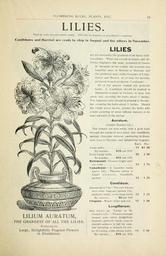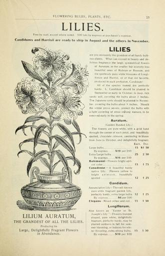 | Keywords: Bulbs and plants (16387458062).jpg  FLOWERING BULBS PLANTS ETC <br> 15 <br> LILIES <br> Free by mail except where noted 100 lots by express at purchaser's expense <br> Candidums and Harrisii are ready to ship in August and the others in November <br> LILIUM AURATUM <br> THE GRANDEST OF ALL THE LILIES <br> Producing its <br> Large Delightfully Fragrant Flowers <br> in Abundance <br> LILIES <br> are pre-eminently the grandest of all hardy bulb- <br> ous plants What can exceed in beauty and de- <br> licious fragrance the large symmetrical flowers <br> of Auratum or the smaller but scarcely less <br> beautiful ones of Rubrum or Roseum and <br> the spotlessly pure white blossoms of Longi- <br> florum and Harrisi or of that old favorite <br> produced in such profusion Candidum <br> All of the species named are perfectly <br> hardy L Candidum should be planted in <br> September or early in October in deep rich <br> sandy soil covering the bulbs about 3 inches <br> The Japanese sorts should be planted in Novem- <br> ber covering the bulbs about 9 inches Should <br> the winter prove severe protect the bulbs with <br> a light covering of straw or Iong manure to be <br> removed early in the spring <br> Auratum <br> Golden Banded Lily <br> The flowers are pure white with a gold band <br> through the center of each petal and beautifully- <br> spotted chocolate crimson continuing in bloom <br> from June to October and delightfully fragrant <br> Each Doz <br> Large bulbs 15 150 <br> By express 10 per 100 <br> Extra Large bulbs 25 2 50 <br> By express 16 per 100 <br> Bafemanni  Flowers bright apri- <br> cot color 15 1 75 <br> Canadense  A beautiful hardy <br> native Lily Flowers yellow to <br> bright crimson beautifully <br> spotted 12 1 25 <br> Candidum <br> Annunciation Lily  The well-known <br> pure white fragrant garden Lily <br> perfectly hardy extra large bulbs 12 1 25 <br> By express 6 per 100 <br> Elegans  Mixed yellow and red 15 1 50 <br> Longiflorum <br> Also known as Easter or St <br> Joseph's Lily  Flowers trumpet <br> shaped pure white delightfully <br> fragrant perfectly hardy may be <br> planted outdoors in fall for sum- <br> mer blooming or indoors for win- <br> ter flowering extra strong bulbs 15 1 50 <br> By express 10 per 100 42214145 133055 65937 Page 15 Text http //www biodiversitylibrary org/page/42214145 1908 10 5962/bhl title 65937 Currie Brothers Company ; Henry G Gilbert Nursery and Seed Trade Catalog Collection NameFound Auratum NameFound Candidum NameFound Elegans NameConfirmed Elegans NameBankID 5116399 NameFound Lilium auratum NameConfirmed Lilium auratum EOLID 1003309 NameBankID 5416786 NameFound Longiflorum NameFound Rubrum Biodiversity Heritage Library Currie Bros Co Bulbs and plants autumn 1901 Garden Stories Bulbs Plants Catalogs Flowers Nurseries Horticulture Plants Ornamental Seeds U S Department of Agriculture National Agricultural Library bhl page 42214145 dc identifier http //biodiversitylibrary org/page/42214145 bhlGardenStories BHLinbloom bulbs plants nurseries horticulture plants ornamental u s department of agriculture national agricultural library bhlgardenstories bhlinbloom Information field Flickr posted date ISOdate 2015-01-28 Check categories 2015 August 24 CC-BY-2 0 BioDivLibrary https //flickr com/photos/61021753 N02/16387458062 2015-08-24 07 56 30 cc-by-2 0 PD-old-70-1923 Currie Bros catalogs Photos uploaded from Flickr by FĂŚ using a script |