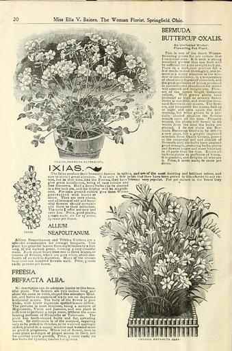 Keywords: Bulbs roses plants of all kinds for winter blooming (16395840865).jpg can do adequate justice to this beau- <br> tiful plant The flowers are two inches long and <br> about the same in width shaped like miniature Glad- <br> ioli and borne in clusters of sis to ten on depressed <br> horizontal scapes The body of the flower is pure <br> white with lower segments spotted lemon-yellow <br> The perfume is most delicious being a mixture of <br> Mignonette Violet and Jasmine and one plant is <br> sufficient to perfume a large room without the over- <br> bearing perfume of Hyacinths or Tuberoses The <br> plant has tooth-shaped bulbs and flat spreading <br> leaves Its cultivation is of the simplest requiring <br> only to be potted in October to be watered sparingly <br> at first placed in a sunny window and watered more <br> as growth progresses When out of flower store in <br> some place and repot at proper season in fresh soil <br> for another year's growth Price 3 cents each; six <br> fine bulbs for 15 cents; twelve for 25 cents <br> FREESIA REFKACTA ALBA 41881528 131173 64737 Page 20 Text http //www biodiversitylibrary org/page/41881528 1897 10 5962/bhl title 64737 Ella V Baines Firm ; Henry G Gilbert Nursery and Seed Trade Catalog Collection NameFound ALLIUM NameConfirmed Allium EOLID 11378177 NameBankID 2662323 NameFound Allium neapolitanum NameConfirmed Allium neapolitanum EOLID 1084743 NameBankID 2662372 NameFound Cernua NameConfirmed Cernua EOLID 4578743 NameBankID 176392 NameFound Freesia refracta NameConfirmed Freesia refracta EOLID 11336544 NameBankID 2773643 NameFound Ixias NameConfirmed Ixias EOLID 20134 NameBankID 3002058 NameFound Oxalis NameConfirmed Oxalis sect Pseudobulbosae Norlind EOLID 40270 Biodiversity Heritage Library Bulbs roses plants of all kinds for winter blooming all the very best and choicest varieties 1897 Garden Stories Bulbs Plants Catalogs Flowers Plants Ornamental Seed industry and trade Seeds Trade catalogs U S Department of Agriculture National Agricultural Library bhl page 41881528 dc identifier http //biodiversitylibrary org/page/41881528 bhlGardenStories BHLinbloom bulbs plants plants ornamental u s department of agriculture national agricultural library bhlgardenstories bhlinbloom Information field Flickr posted date ISOdate 2015-01-29 CC-BY-2 0 BioDivLibrary https //flickr com/photos/61021753 N02/16395840865 2015-08-24 06 53 45 cc-by-2 0 PD-old-70-1923 Bulbs roses plants of all kinds for winter blooming Photos uploaded from Flickr by Fæ using a script |