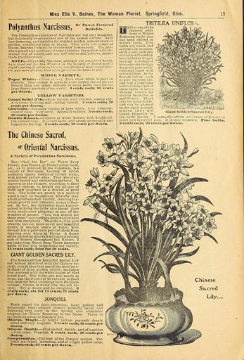Keywords: Bulbs, roses, plants of all kinds for winter blooming (16581636761).jpg Miss Ella V Baines The Woman Florist Springfield Ohio <br> 13 <br> Or Bunch Flowered <br> Daffodils <br> Polyanthus Narcissus <br> The Polyanthus varieties of Narcissus are not only beautiful <br> but delieiously sweet-scented and of the easiest culture Very <br> free flowering and suitable for window-garden conservatory or <br> garden continuing long in bloom They have tall spikes of <br> bloom bearing trom six to twenty-four flowers each The pure <br> white petals and gold cup of some varieties the yellow with tho <br> orange cup of others and the self whites and yellows render <br> them great favorites <br> NOTE ” Polyanthus Narcissus although not considered hardy <br> have lived out for two Winters in the vicinity of Boston with a <br> slight covering of straw and leaves and produced much larger flow- <br> ers and more of them than when gr lull in the house in pots <br> WHITE VARIETY <br> Paper White ” Tot us- A bus Pure snow white flowers in <br> clusters This variety is perhaps riore largely forced lor cut <br> flowers than any other millions of them being used for the <br> large flower markets of the world 4 cents eacli; 40 cents <br> per dozen <br> YELLOW VARIETIES <br> Grand Solid d'Or ” Rich yellow With reddish orange cup <br> A favorite bedding and cutting variety 5 cents each; 50 <br> cents per dozen <br> Glorlosus ” Immense trusses of pure -white with primrose- <br> colored cups Very early Splendid to force 5 cents each; <br> 50 cents per dozen <br> Double Roman ”Clusters of white flowers with double cit- <br> ron-colored cups It is very early and grown principally and <br> largely for forcing 4 cents each; 40 cents per dozen <br> The Chinese Sacred <br> or Oriental Narcissus <br> A Variety of Polyanthus Narcissus <br> The Shui Sin Far or Water Fairy <br> Flower Joss Flower or Flower of the Gods <br> etc as it is called by the Celestials is a <br> variety of Narcissus bearing in lavish <br> profusion chaste flowers of silvery white <br> with golden yellow cups They are of ex- <br> quisite beauty and entrancing perfume It <br> lsgrown by the Chinese according to their <br> ancient custom to herald the advent of <br> their new year and as a symbol of good <br> luck The bulbs are grown by a method <br> known only to themselves whereby they <br> attain great size and vitality insuring lux- <br> urious growth and immense spikes of flow- <br> ers In fact the incredibly short time re- <br> quired to bring the bulbs into bloom four <br> to six weeks alter planting is one of the <br> wonders of nature You can almost see <br> them grow succeedingalmost everywhere <br> and with everybody Theydowelfin pots <br> of earth but are more novel and beautiful <br> grown in shallow bowls of water with <br> enough fancy pebbles to prevent them from <br> toppling over when in bloom A dozen <br> bulbs started at intervals will give a succes- <br> sion of flowers throughout the Winter I <br> am importing direct from China immense <br> bulbs of the true large-flowering variety <br> 15 cents each; four for 50 cents <br> GIANT GOLDEN SACRED LILY <br> The flowers of this beautiful Sacred Lily <br> are almost identical with the Chinese va- <br> riety except that they are of the most love- <br> ly shade of deep golden yellow making a <br> fine contrast with the white bloom of that <br> noted kind The bulbs are not nearly so <br> large but the trusses of flowers are of good <br> size making thisa charming bulb for house <br> culture Grows in water like the old va- <br> riety Try a dozen and be delighted 3 <br> cents each; six for 15 cents; 25 cents <br> per dozen <br> JONQUILS <br> Much prized for their charming large golden and <br> deliciously sweet scented flowers perfectly hardy and <br> flowering very early in the Spring; also admirably <br> adapted for Winter flowering in the house Three to t <br> six bulbs in a four or five-inch pot <br> Odorus Single ” A bright yellow perianth deeply <br> lobed and very fragrant 2 cents each; 20 cents per 6 <br> dozen <br> Odorus Double ” Flowers full double and of a golden <br> yellow color Fragrant 4 cents each; 40 cents per <br> dozen <br> Campernelles ” The best of the Jonquil section Per- <br> ianth six lobed spreading and of a light yellow color <br> 3 cents each; 25 cents per dozen <br> TRITILEA UNIFLORA <br> mHIS is one of the <br> choicest addi- <br> tions to Winter <br> flowering bulbs that <br> has been offered in <br> many years The <br> bulbs are small and <br> several can be plant- <br> ed in a pot each one <br> of which will send up <br> several flower scapes <br> bearing star shaped <br> blossoms one inch in <br> diameter pure white <br> elegantly lined with <br> celestial blue Asthe <br> flowers follow each <br> other successively <br> and last a long time <br> before fading a potof <br> these bulbs is never <br> without flowers for <br> several months in <br> mid-Winler They <br> are also quite hardy <br> and can be planted <br> in the open ground <br> where they will <br> bloom elegantly in <br> the early Spring I earnestly advise all lovers of flowers to <br> plant this beautiful gem It is sure to thrive Fine bulbs <br> 2 cents each; 20 cents per dozen <br> -- ft B bCi <br> Giant Golden Sacred Lily 41846870 130959 64576 Page 13 Text http //www biodiversitylibrary org/page/41846870 1901 10 5962/bhl title 64576 Ella V Baines Firm ; Henry G Gilbert Nursery and Seed Trade Catalog Collection NameFound Polyanthus NameConfirmed Polyanthus NameBankID 3485302 Biodiversity Heritage Library Bulbs roses plants of all kinds for winter blooming 1901 Garden Stories Bulbs Plants Catalogs Flowers Plants Ornamental Seed industry and trade Seeds Trade catalogs U S Department of Agriculture National Agricultural Library bhl page 41846870 dc identifier http //biodiversitylibrary org/page/41846870 bhlGardenStories Miss Ella V Baines Chinese Sacred Lily BHLinbloom bulbs 