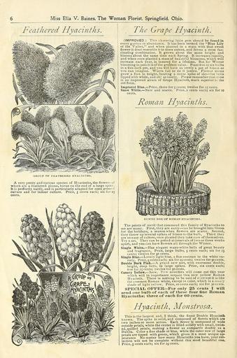 Keywords: Bulbs roses plants of all kinds for winter blooming (16394875822).jpg Miss Ella V Baines The Woman Florist Springfield Ohio <br> Feathered Hyacinths <br> stwxwaATta <br> GROUP OF FEATHERED HYACINTHS <br> A very pretty and curious species of Hyacinths the flowers of <br> which are a feathered plume borne on the end of a large spiki- <br> It is perfectly hardy and is particularly adapted for open ground <br> culture and for indoor culture Price 5 cents each; six for 25 <br> cents <br> The Grape Hyacinth <br> IMPROVED This charming little gem should be found in <br> every garden in abundance It lias been termed the Blue Lily <br> of trie Valley 1 ' and when planted in a mass with that sweet <br> flower it does resemble it to some extent and forms a most fas- <br> cinating combination It grows about the same height and <br> blooms about the same time each Spring It increases rapidly <br> and when once planted a mass of beautiful blossoms which will <br> increase each year is insured for a lifetime But for Winter <br> blooming in pots it is of the greatest value Plant five or six bulbs <br> in a five-inch pot and you will have as lovely a pot of bloom as <br> you can imagine Words fail to do it justice Flower stems <br> grow a foot in height bearing a dense spike of sky-blue bells <br> tipped with white and ohl so lovely Please rememberthat mine <br> is an improved strain of Grape Hyacinth much superior to the <br> old form <br> Improved Blue Price three for 5 cents; twelve for 15 cents <br> Snow White New and scarce Price 2 cents each; six for iq <br> cents <br> Roman Hyacinths <br> RUSTIC BOX OF ROMAN HYACINTHS <br> The points of merit that commend this family of Hyacinths to <br> me are many First they are early can be brought into bloom <br> for the holidays a season when flowers are scarce Second <br> they throw up several spikes of bloom to the bulb Third they <br> are so easy of culture once planted they take care of themselves <br> Try a set They can be potted at intervals of two or three weeks <br> apart and you can have flowers all through the Winter <br> Single White Has elegant waxy-white bells of great beauty <br> and fragrance Price large bulbs 5 cents each; six for 25 <br> cents; twelve for to cents <br> Single Blue Lovely light blue a fine contrast to the white va- <br> riety Price 5 cents each; six for 35 cents; twelve for 50 cents <br> Double Bark Pink A grand new sort with enormous double <br> bright deep bells in large spikes Price six cents each; <br> five for 25 cents; twelve lor 50 cents <br> Canary Yellow Mew Few novelties will come out this year <br> which will in importance surpass this new yellow Roman <br> Hyacinth There is nothing to be said of it except it is like <br> the common Roman white except in color which is a lovely- <br> shade of light yellow Price 10 cents each; six for 50 cents <br> SPECIAL OFFER For only 25 cents I will <br> send one bulb of each of these four fine Roman <br> Hyacinths; three of each for 60 cents <br> Hyacinth Monstrosa <br> This is the largest and I think the finest Double Hyacinth <br> known The spike is solid and composed of florets which are <br> two inches or more across Each flower is composed of wide <br> outside petals while the center is filled solidly with small twist- <br> ed quilled petals making a flower as compactly double as a <br> Dahlia Color a fine shade oi blue while the outer row of large <br> petals are tipped with green which gives it a most unique ap- <br> pearance No matter how many Hyacinths you have your col- <br> lection will not be complete without this most beautiful one <br> Price 5 cents each; six for 25 cents 41881514 131173 64737 Page 6 Text http //www biodiversitylibrary org/page/41881514 1897 10 5962/bhl title 64737 Ella V Baines Firm ; Henry G Gilbert Nursery and Seed Trade Catalog Collection Biodiversity Heritage Library Bulbs roses plants of all kinds for winter blooming all the very best and choicest varieties 1897 Garden Stories Bulbs Plants Catalogs Flowers Plants Ornamental Seed industry and trade Seeds Trade catalogs U S Department of Agriculture National Agricultural Library bhl page 41881514 dc identifier http //biodiversitylibrary org/page/41881514 bhlGardenStories BHLinbloom bulbs plants plants ornamental u s department of agriculture national agricultural library bhlgardenstories bhlinbloom Information field Flickr posted date ISOdate 2015-01-29 CC-BY-2 0 BioDivLibrary https //flickr com/photos/61021753 N02/16394875822 2015-08-24 06 55 06 cc-by-2 0 PD-old-70-1923 Bulbs roses plants of all kinds for winter blooming Photos uploaded from Flickr by FĂŚ using a script |