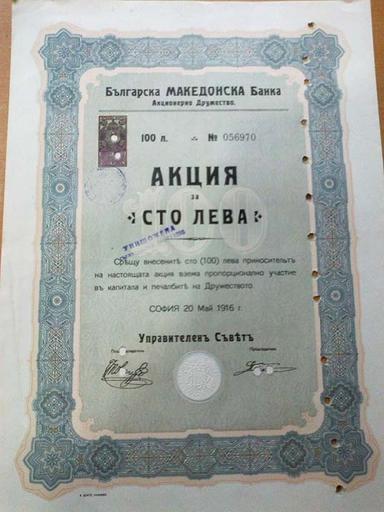Keywords: Bulgarian Macedonian Bank 100 levs.JPG Акция на Бълга ската македонска банка scanned 1916-05-20 Бълга ската македонска банка PD-old Revenue stamps on documents Stock certificates of banks in Bulgaria Former banks in Sofia
